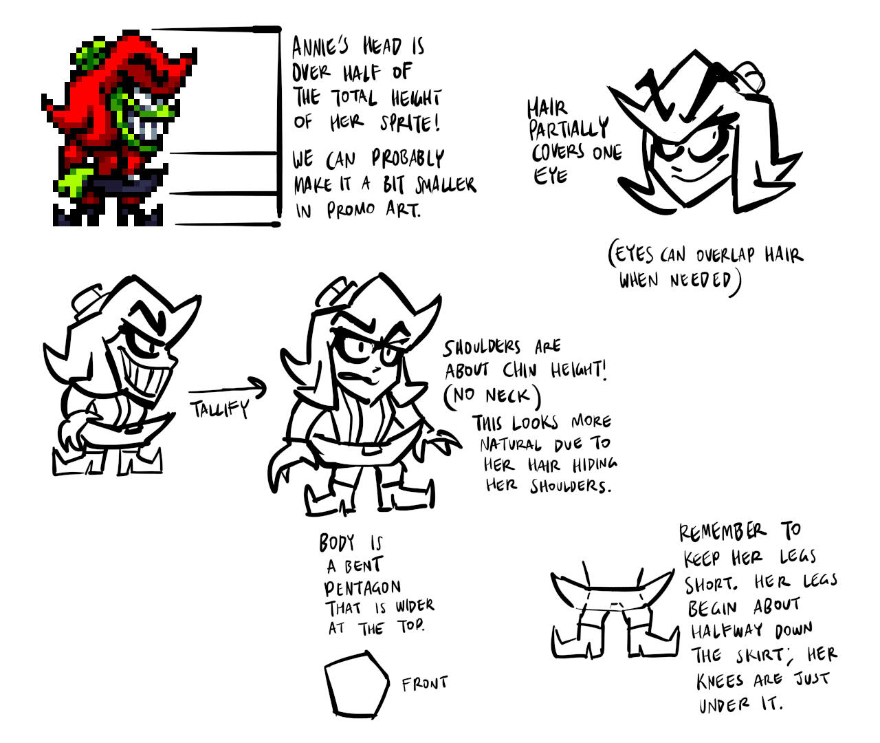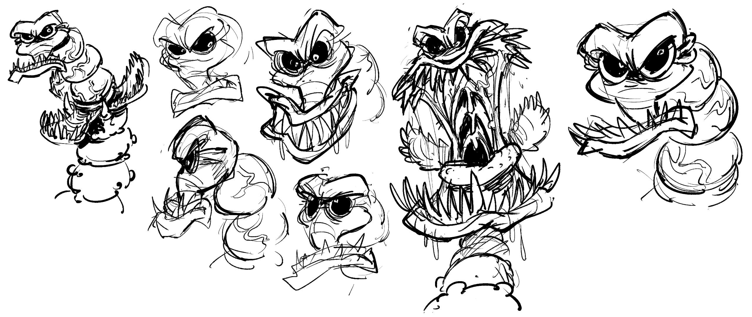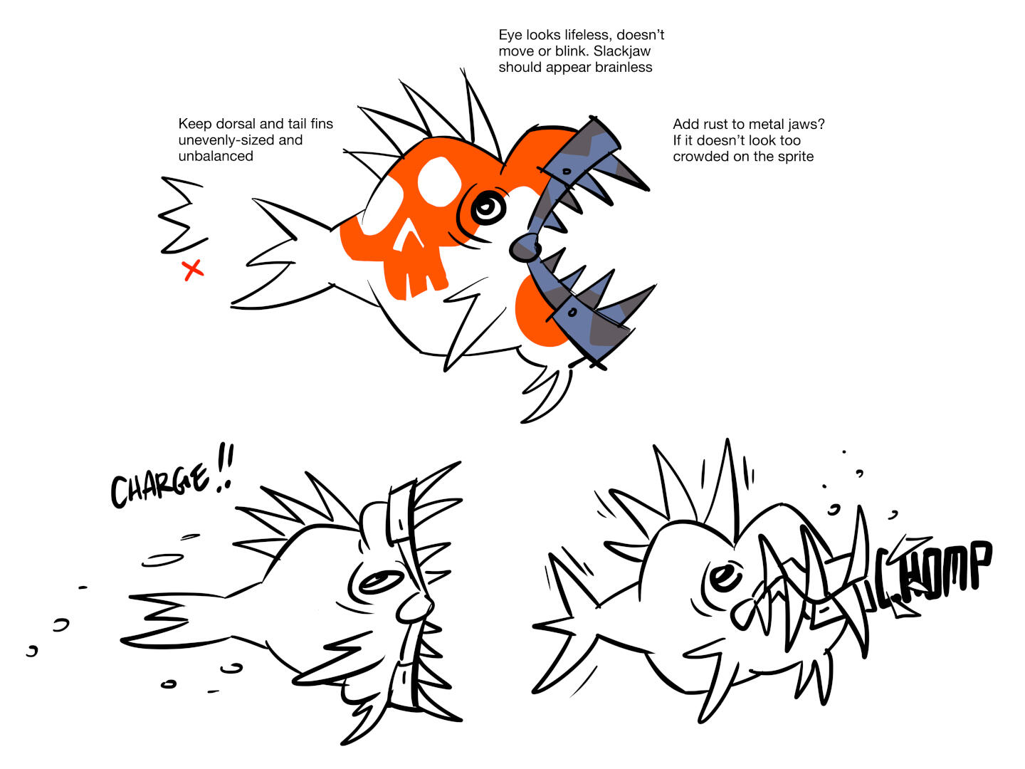 Character design on ANTONBLAST was highly collaborative and almost every design in the game was a combination of takes from different team members. One of my duties was specifying the final looks for Annie and Satan, although it took the combined effort of the whole team to produce all the ideas I blended together for their final designs. Some designs where I played a more foundational role include the Jewel Ghoul heart, Bonny (the parrot pirate), and Slackjaw (the Glasshouse koi fish monster). I also really enjoyed working on the Freako Dragon, even though we decided to go in a different direction for his final design from what I submitted. For many of the common enemies, I did subtle refining to exaggerate certain elements and bring them in line with the game's bold angular art style.