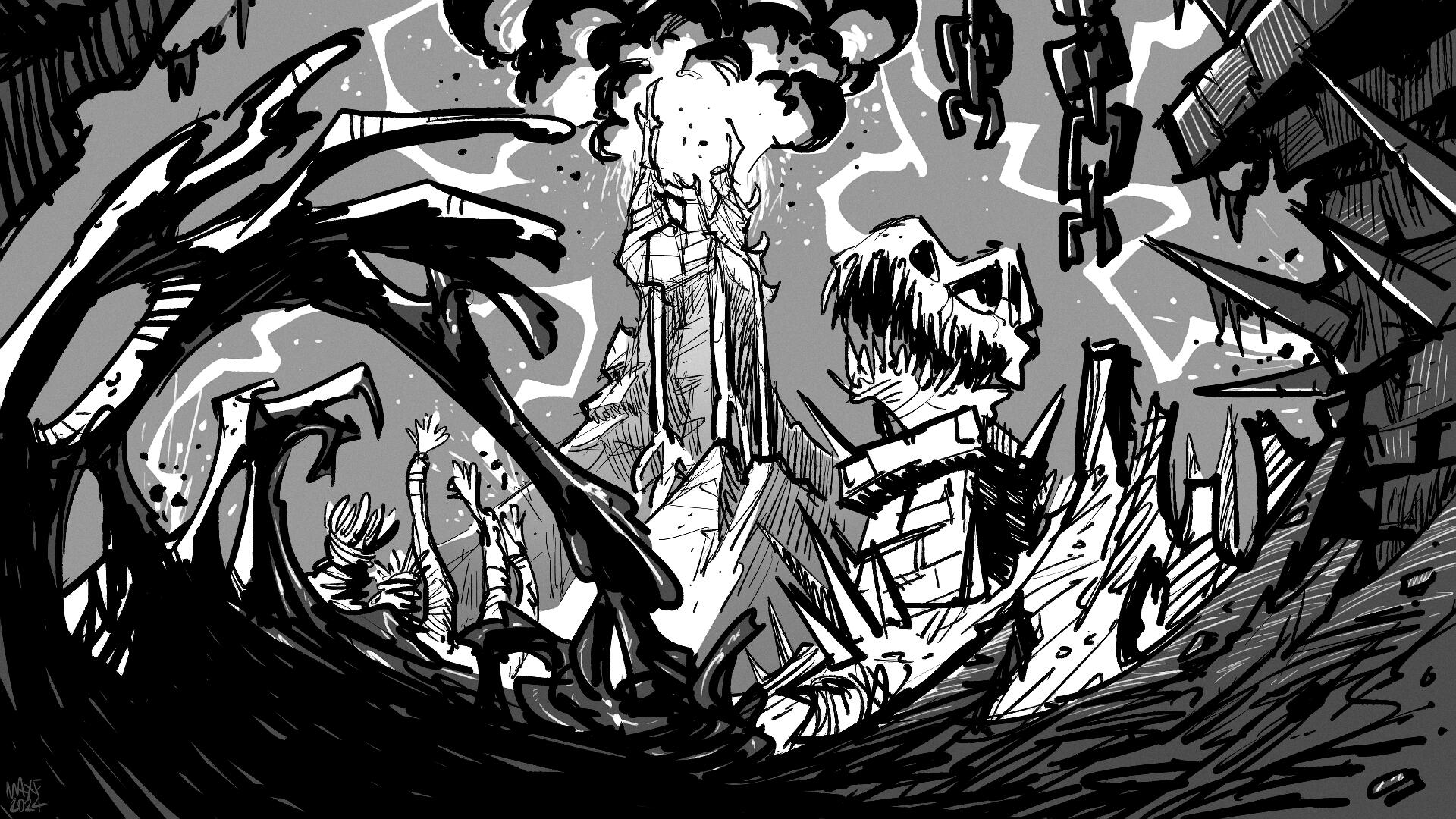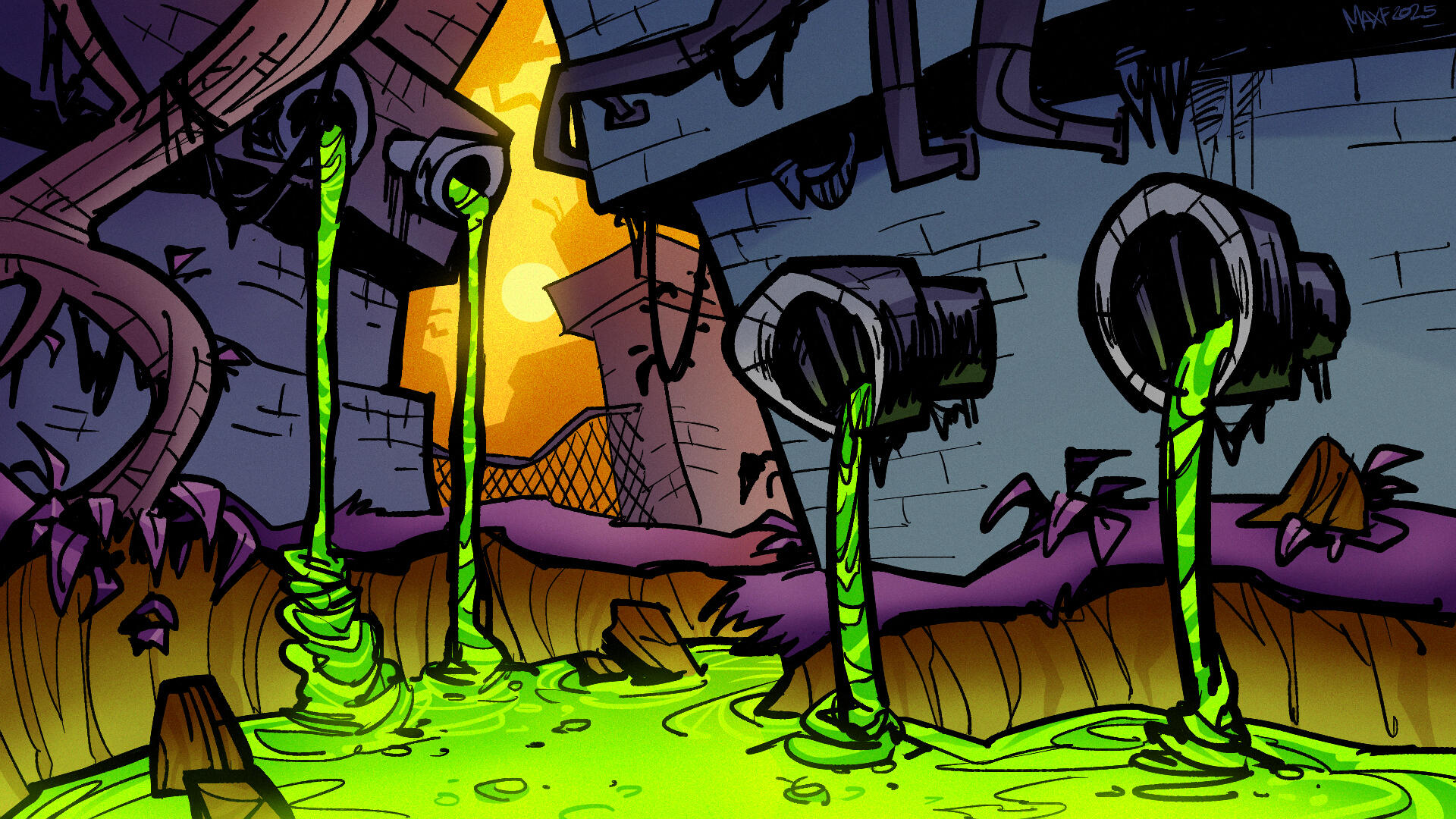 I worked on the game ANTONBLAST as a remote contractor for Summitsphere from 2021-2024. As Lead Environment Artist and Concept Artist, I headed visual development on all the game's environments, and led the creation of in-game level assets. The project lead and I often juggled art direction duties, wherein I gathered reference materials, established style rules for shapes, lighting, and colour, and oversaw other artists on the team. I designed the art style for the game’s promotional artwork, utilising thick angular purple linework and halftone dots to convey the game’s loud punk comic style. Partway through the project I joined the level design effort and contributed two levels, Slowroast Sewer and The Big Bath. I was also involved in character design, from rough explorations to final reference materials for various characters and enemies.