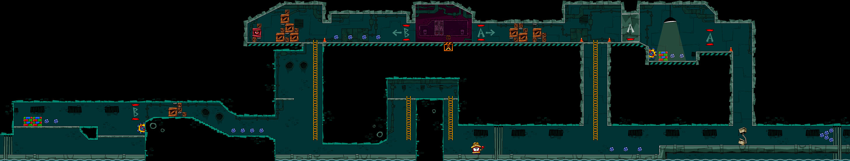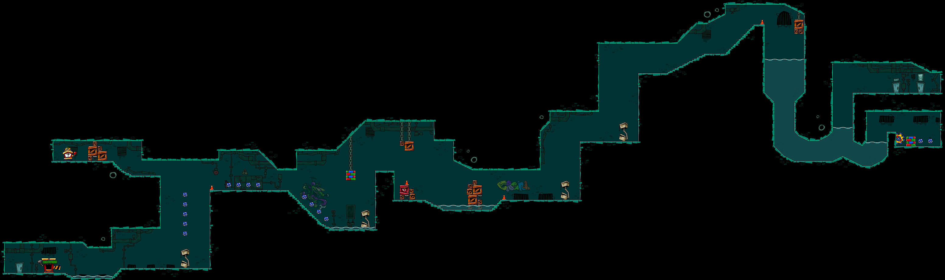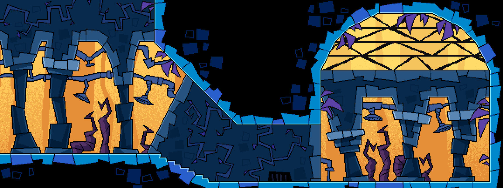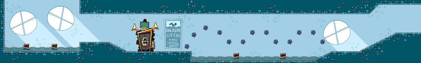 The Big Bath is set in a haunted bathhouse, whose layout changes behind the player’s back to create a confusing, unpredictable space. I wanted to leverage the unsettling elements of liminal spaces within the constraints of a 2D action-platformer to create an eerie, desolate atmosphere that would stand out from the game's other levels. As the level proceeds, it becomes more abstract, with infinitely-looping hallways and floating pools of water. We achieved the spatial tricks in the level via a combination of directly rearranging the level geometry off-screen, and silently teleporting the player to near-identical copies of rooms. The latter method required some of the level’s rooms to be conjoined within the game engine in ways that aren’t apparent while playing, in order to teleport the player smoothly without the engine loading or offloading discrete rooms.