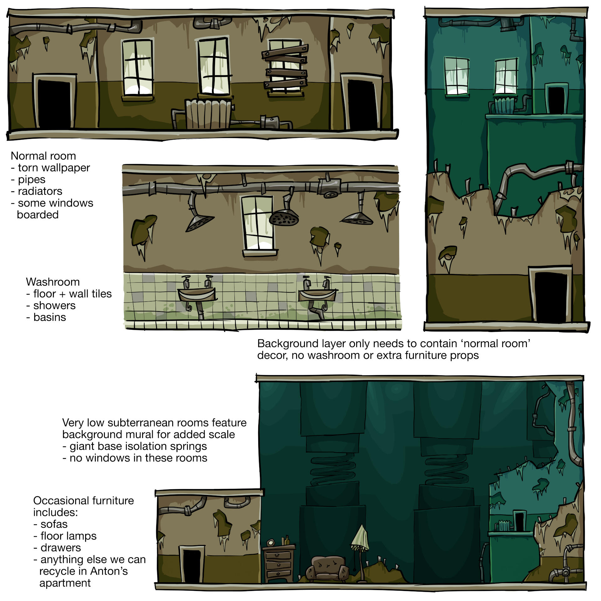 Some bonus stuff: First, a detailed reference for the street-view shot of Anton and Annie's apartment during the opening cutscene. In this shot, we specifically wanted to integrate the car Anton smashed in the ending cutscene of Antonball Deluxe, to create a fun sense of continuity with the previous game. Second, my initial pitch for the save file menu design, which ended up translated directly into the final game. Third, some variants on a background plate concept for the ending cutscene showing Satan amid the wreckage of his castle; and last but not least, Annie as a goblin shark.