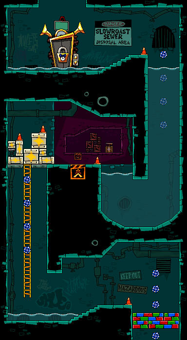 I designed, built, and art-passed two of the game’s 12 levels, Slowroast Sewer and The Big Bath. Slowroast Sewer received additional work from other designers in the form of the Sewer Shark vehicle rooms and the silhouetted fire rooms, although I was responsible for the visual design of the silhouette rooms. I also performed final revisions and art pass on the apartments / underground area of Boiler City, adapting the existing level geometry to strengthen flow and readability, and to more closely resemble architectural structures.In Slowroast Sewer, I aimed for a feeling of descending deep into a place you’re not supposed to be in. I’ve always loved the “so close yet so far” level design trope, where the player’s goal is visible nearby but they must traverse a long indirect path to reach it, and I used this several times in Sewer to give the impression of a sprawling facility that extends past the bounds of the game. Art-passing this level was extremely fun; I gathered many reference photos of abandoned industrial basements and utility tunnels to aid in making it feel like a somewhat believable, purposeful space, and I loved working on the many cables, pipes, and air ducts that twist through the tunnels. There's lots of subtle visual detail in this level, like the coloured lights on the electric switchboards that flash to the beat of the music.